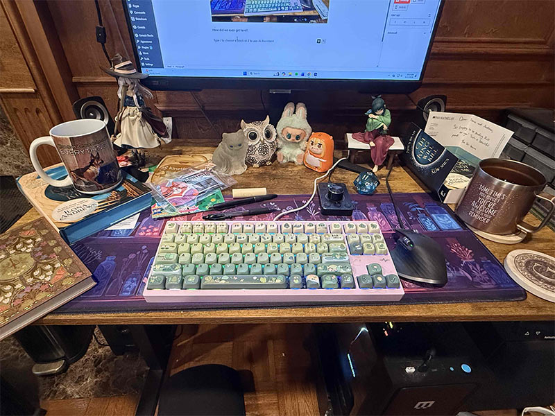 Switches for my custom keyboards. Surprise yarn gift from Gordon. Empty glasses wipes box. Full glasses wipes box. I don’t wear even glasses anymore except for close up things. Random notebooks. Random books. Why is Emerald Blaze out?